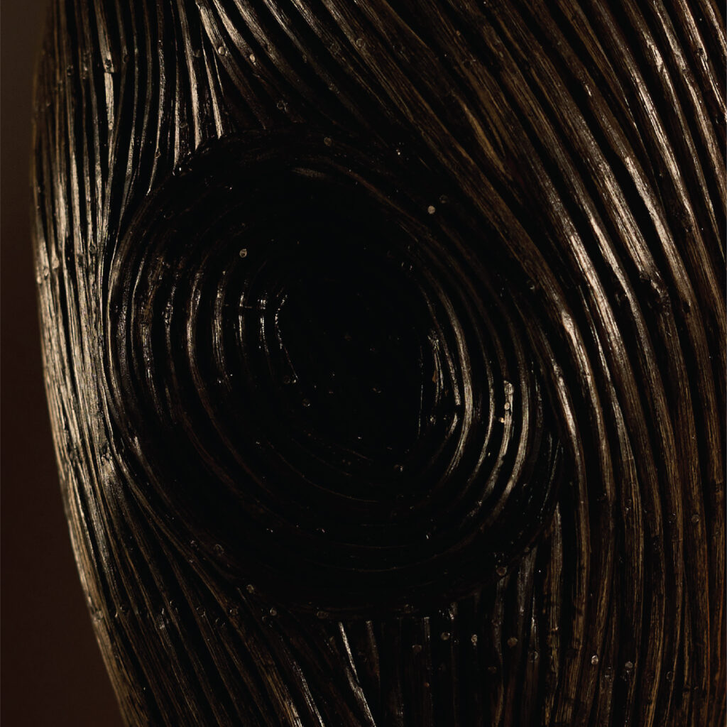 The Fantastic Fungi Lamp captivates with its interplay of form, texture, and light. Crafted from handmade banana fibre paper and reclaimed lantana wood, it features layered curves, hidden folds, and an earthy elegance reminiscent of forest fungi. Its rich, dark-toned external structure contrasts beautifully with the soft amber glow filtering through organically shaped banana fibre accents. The materials heighten the lamp’s tactile appeal—banana fibre paper offers featherlight, rippled translucence, while lantana wood adds depth, grounding, and natural variation.
