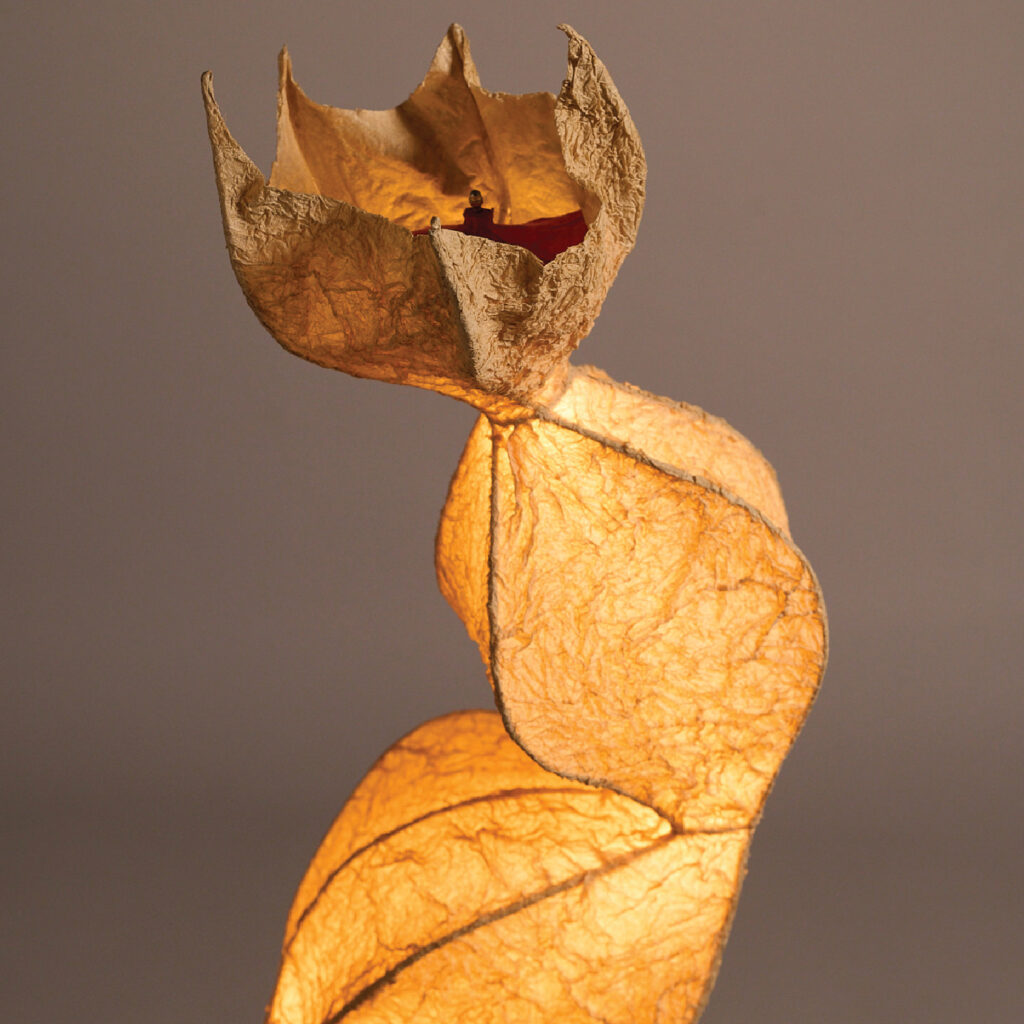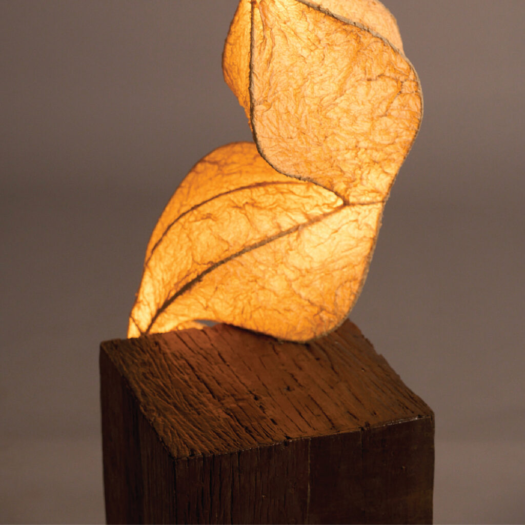 Inspired by the delicate form of the goldenrod gall seed pod, the Goldenrod Floor Lamp extends gracefully from floor to ceiling, embodying fluidity and natural rhythm. Each curve of its form evokes the quiet elegance of nature’s patterns, while the warm amber light it radiates creates an enveloping sense of calm — perfect for winter evenings. Crafted entirely from crushed banana plant fibre paper, its texture mirrors the raw beauty of the natural world. Resting on a reclaimed wooden base, the lamp celebrates imperfections — the creases, veins, and grain — that tell a story of origin and earth. The sculptural silhouette, glowing from within, becomes both an art form and a source of gentle warmth, inviting a connection between nature and the human spirit.