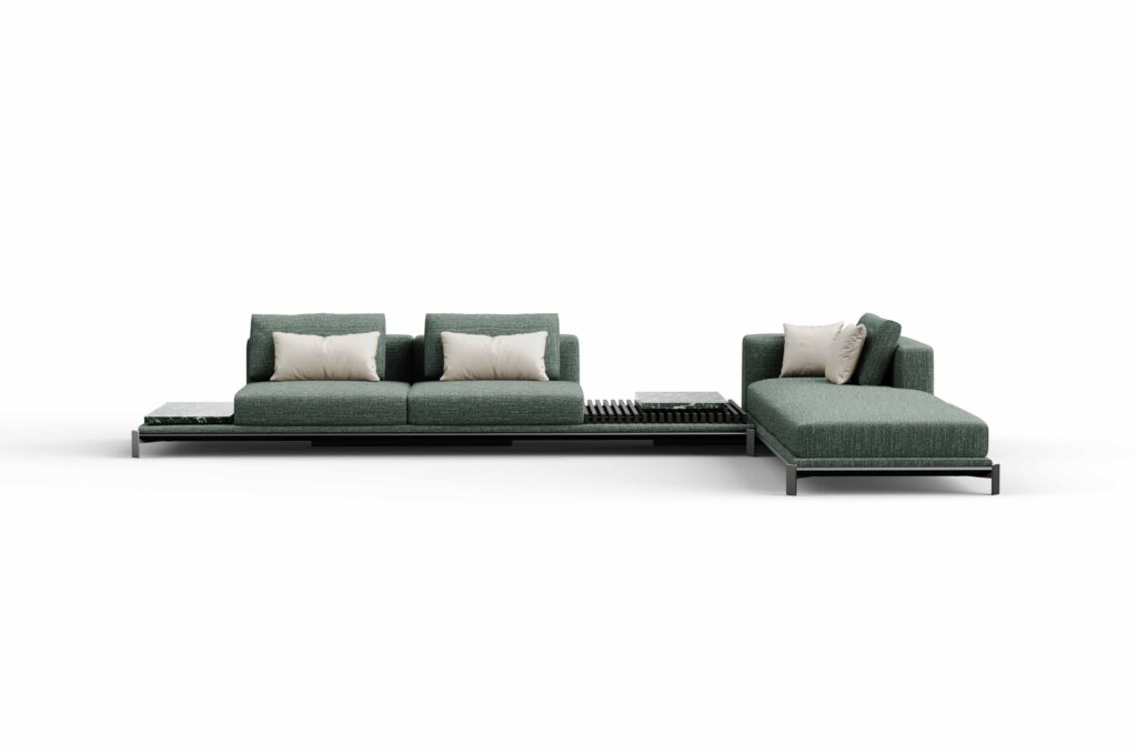At the heart of Bastion lies a seamless balance between structure and softness. A double-chamfered solid wooden base anchors the design, supporting a softly padded upholstered layer that creates a striking play of light and shadow. Clean lines and plush cushioning lend the sofa a composed yet inviting presence, while its modular nature allows for effortless customisation. Bastion features a mix of seating elements and side table modules that can be arranged to suit varied layouts and lifestyles. The side tables are offered in two distinct styles—a refined stone tray for a sleek, polished look, and an artful wooden slat module that adds warmth and texture. Used individually or paired together, they create a visual contrast that enhances the overall composition. Sleek metal legs further elevate the design, introducing a dynamic interplay of straight and angled forms that give Bastion its contemporary edge.